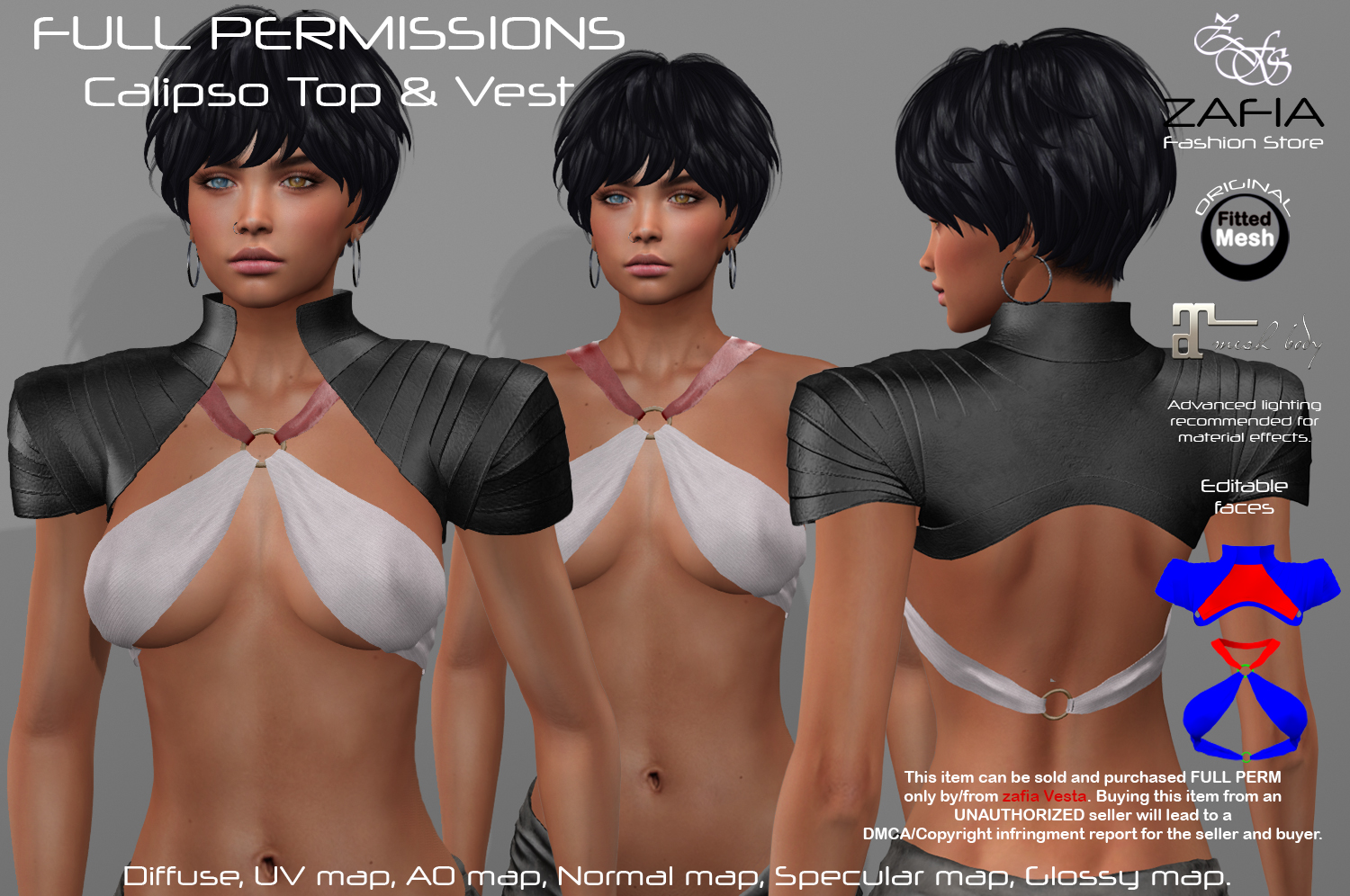 ZAFIA Calipso Top and Vest is a FullPerm and consists of two separate pieces, the top and the vest that can be dressed separately. Exclusive for Maitreya Lara.