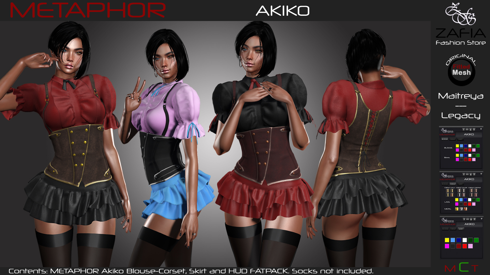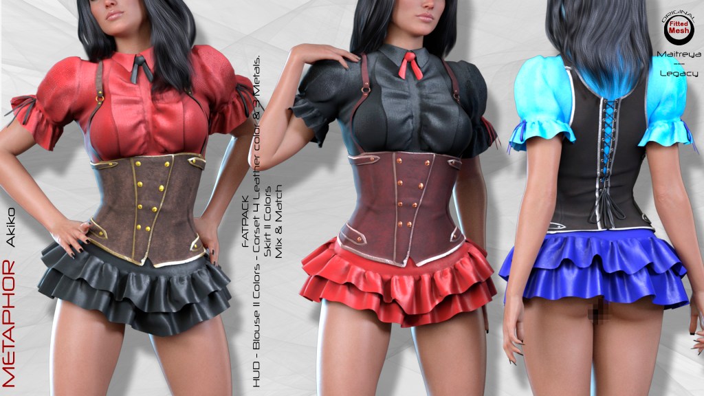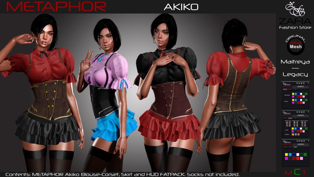 METAPHOR Akiko for Maitreya and Legacy mesh bodies is sold separately in different colors. A FatPack with HUD is also available with which you can change multiple textures and colors.