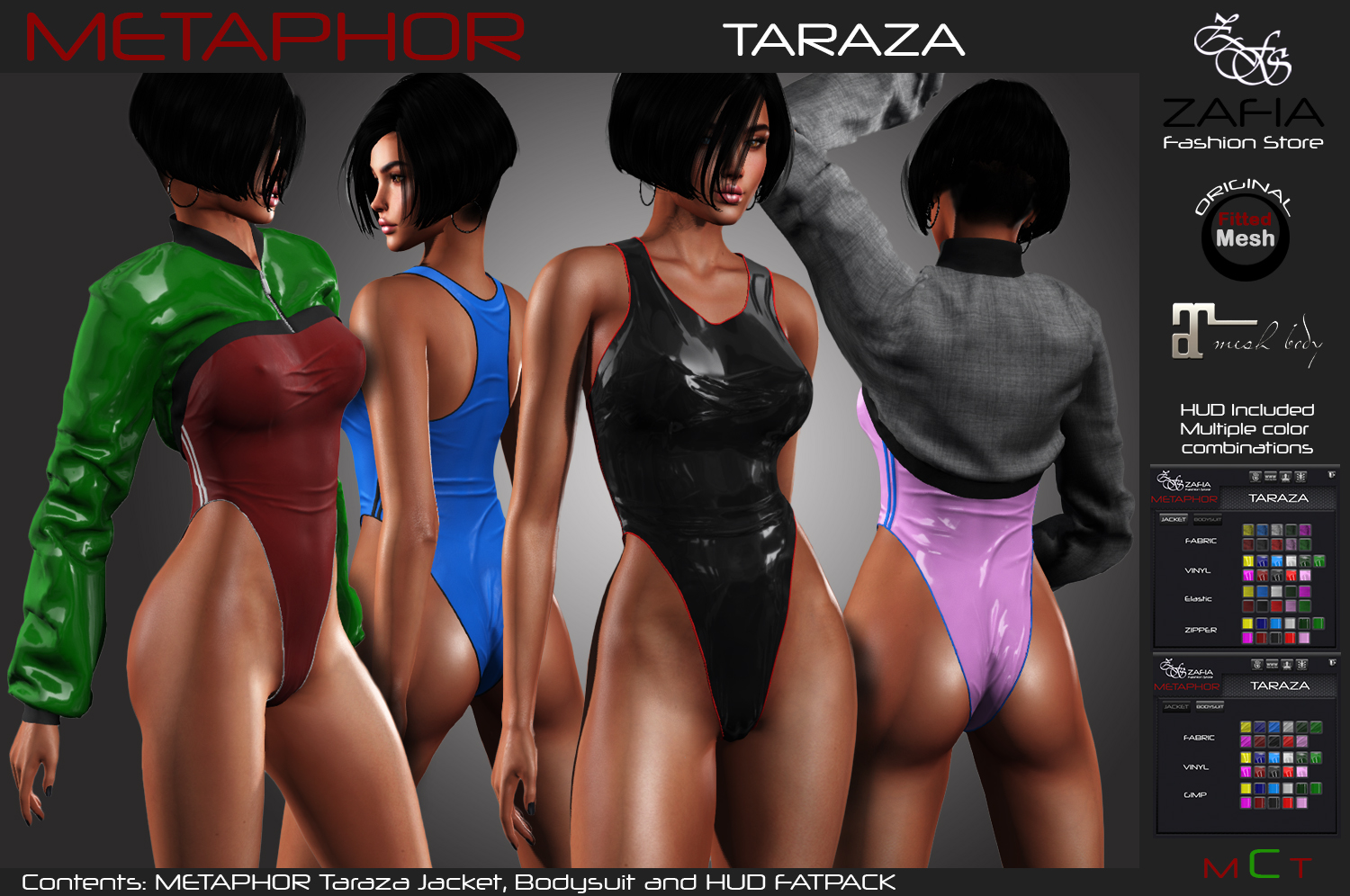 METAPHOR Taraza is a jacket and bodysuit available in fabric and vinyl. Sold separately but with the two options on each garment, fabric and vinyl. There is also a FatPack available with both garments and a HUD with which you can change all the colors of the garment, as well as elastics, cuffs and zippers.